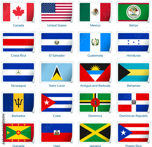 flag, sticker, america, canada, us, us, mexico, belize, costa rica, guatemala, honduras, nicaragua, bahamas, barbados, cuba, dominica, dominican republic, grenada, haiti, jamaica, puerto rico, national flag, vector, illustration, icon, nation, editable, clean