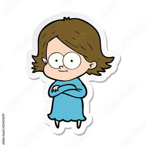 happy, cheerful, woman, female, girl, cartoon, sticker, stick, on, icon, decal, label, drawing, illustration, retro, doodle, freehand, free, hand, drawn, quirky, art, artwork, funny, character