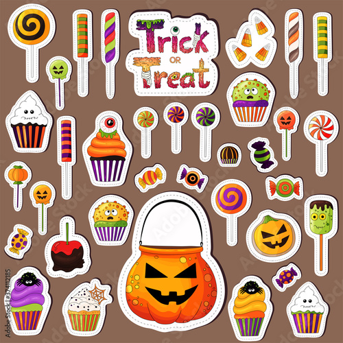 Stickers set of Halloween sweets. Big delicious collection. Hand drawn desserts stickers pack. Scrapbook elements, decoration icons. Halloween treats and treat bowl stickers patch. Isolated.