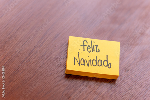 sticky note on a wooden table desk background. written note text is merry christmas