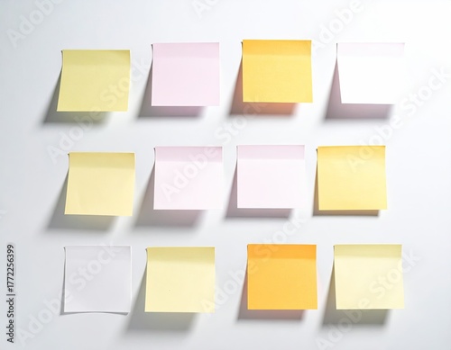 sticky, note, paper, coloured, yellow, pink, white, orange, arrangement, grid, organised, planning, reminder, to do, list, workspace, office, wall, board, project, idea, memo, post-it note, display, bright, light, shadow, simple, clean, minimalist, design, pattern, productivity, task, management, communication, reminder, colourful, geometric, blank, empty
