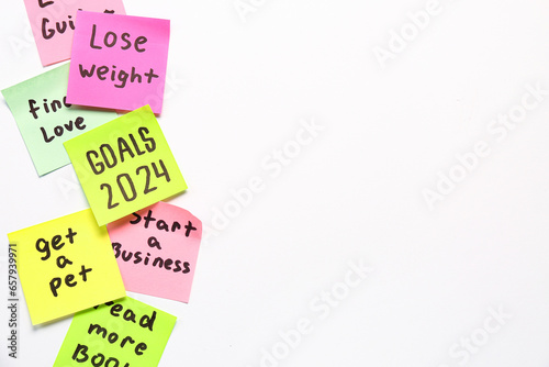 Sticky notes with different goals for 2024 on white background