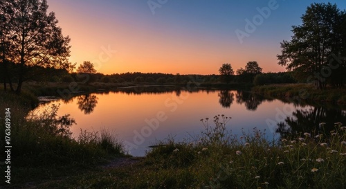 sunset, lake, tree, water, nature, landscape, sky, evening, dusk, twilight, gold, serene, peaceful, calm, calmness, wildflower, grass, horizon, scenic, view, beauty, idylli, romantic, orange, yellow, blue, purple, pink, silhouette, forest, meadow, light, shadow, rural, countryside, summer, spring, autumn, natural, outdoors, environment, quiet, stillness, clear, fresh, pristine, untouched, aethereal
