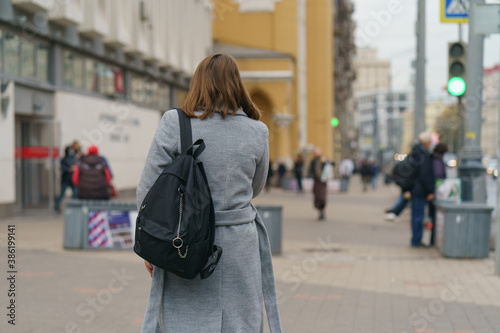 woman, street, back, coat, moscow, russia, autumn, pandemic, grey, backpack, still, life, people, road, city landscape, architecture, adult, blurred, bokeh, building, care, casual attire, caucasian, city, day, defocused, 1, outdoors, pedestrian, powerful, pretty, preventive, style, protection, sidewalk, stop, surgical, town, traffic, light, epidemic, fashion, health, lifestyle, medicals, man, motion