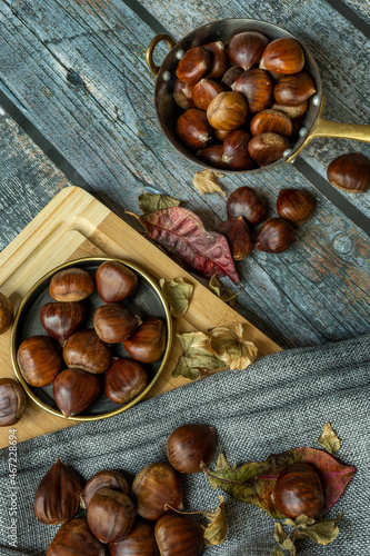 Still life with metal casserole full of chestnuts and dried autumn leaves on gray plank surface and bamboo table with tea towel