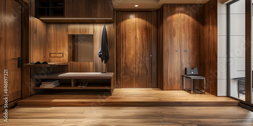 Stilvolles, modernes Interieur im Eingangsbereich aus Holz mit gemütlichem Holzton, zeitgenössisches Zuhause, Garderobe im Flur