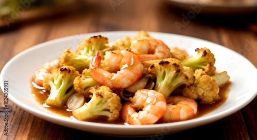 Stir fried Cauliflower and shrimp with oyster sauce in white plate