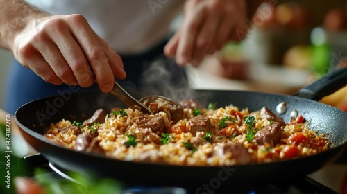 rice, meat, vegetable, pan, cooking, food, preparation, culinary, meal, ingredient, dish, spoon, steam, homemade, cookery, epicure, fresh, healthy, delicious, dinner, lunch, cooked, closeup, studio, nourishment, receipe, plate, gastronomy, diet, tomatoes, parsley, cook, frying, heat, aroma, domestic, eat, kitchen, fire, frying pan, utensil, stir, fried, savoury, tasty, balanced, brown, green, hot