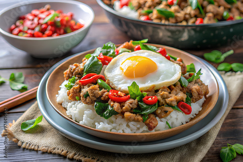 Stir-fried basil with Pork and fried egg on rice, on modern table, Thai food concept
