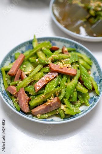 bitter, melon, luncheon, meat, stir fry, chinese, home, food, vegetable, plate, pattern, sauce, garlic, sliced, lunch, hot, colours, pairing, healthy