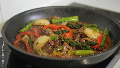 stir fry, meat, vegetable, asparagus, pepper, onion, cooking, pan, food, dish, healthy, dinner, receipe, cookery, protein, fresh, seasoning, favor, hot, delicious, alimentary, meal, preparation, image, detail, stirred, edible, savoury, appetising, nutrient, tasty, ingredient