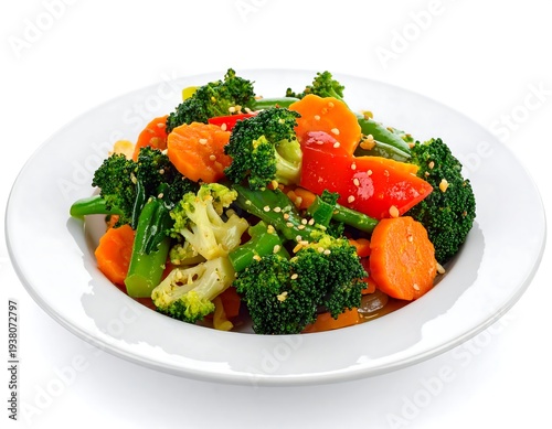 Stir-fried mix of vegetables with vibrant green broccoli, orange carrots, and red bell peppers on a white plate