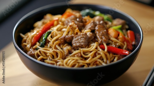 noodle, beef, vegetable, dish, food, bowl, asian, chinese, meal, plate, eatery, tasty, delicious, appetising, dinner, lunch, healthy, protein, cookery, eating, savoury, mealtime, hot, cooked, brown, dark, yellow, red, green, orange, brownish, light, light brown, closeup, image, photo