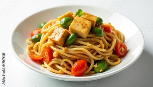 Stir-fried noodles with vegetables and tofu on white background, eat, vegetables