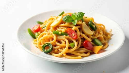 Stir-fried noodles with vegetables, white backdrop, china, appetizer