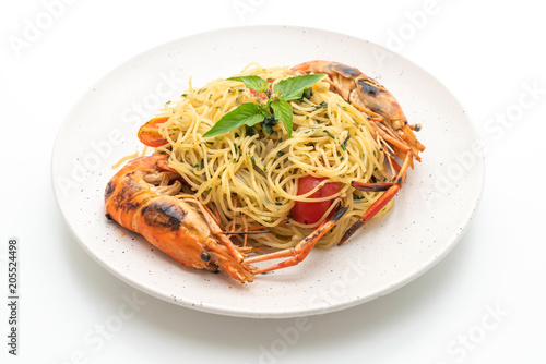 stir-fried spaghetti with grilled shrimps and tomatoes