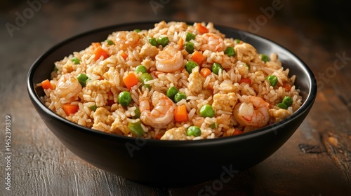 Stir-fried yangzhou fried rice with shrimp, peas, carrots, and egg, wok hei visible, served in a porcelain bowl.