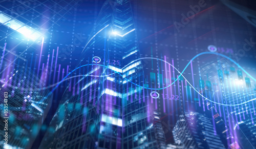 Stock market business concept. Financial graphs and digital indicators with modern city background