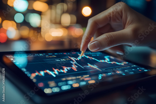 banking, graph, horizontal, investment, photo, color image, business, technology, touch screen, wireless technology, analysing, chart, currency, finance, indoor, cyberspace, one person, trading, office, people, computer, mobile phone, adult, hand
