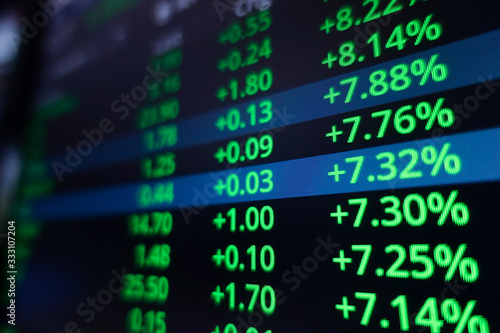 Stock market trading ticker on screen monitor background. Financial investment and economic concept.