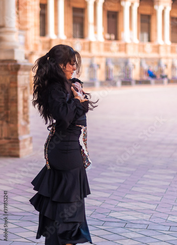 Stock photo of a flamenco dancer dancing and feeling flamenco. Woman outdoors dancing flamenco with a black dress.
