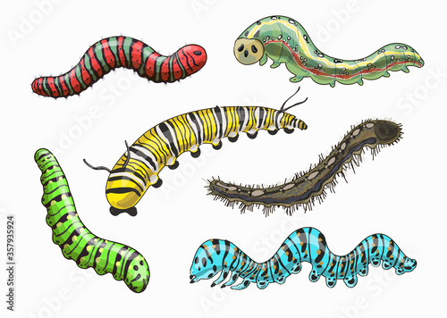 Stock vector illustration. Set of caterpillars of different types and colors. Drawing isolated on white background