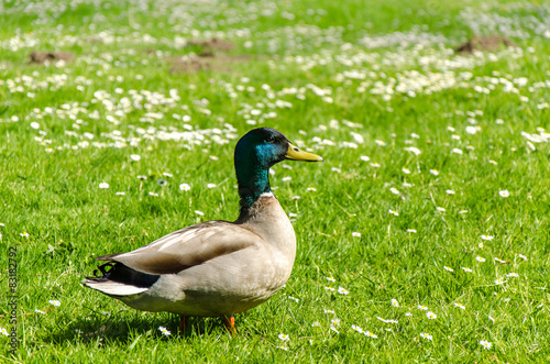anas platyrhynchos, male, standing, meadow, daisy, vogel, flower, man, duck, spring, grass, colourful