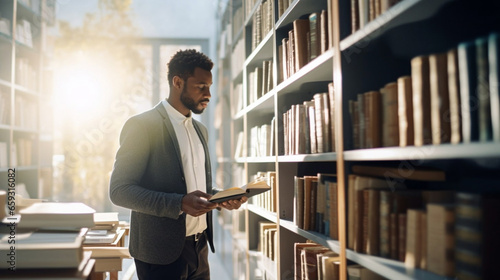 stockphoto, copy space, Black man in a library holding a book. light colored interior, The background consists of bookshelves filled with books. Education theme. Literature.