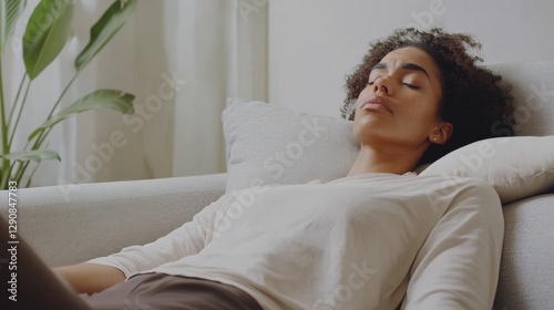 stomach, pain, relief, lying, sofa, pillow, discomfort, comfort, restful, healing, moment, wellness, content, room, minimal, decor, soft, natural, light