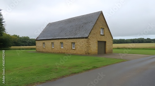barn, stone, building, countryside, landscape, rural, farm, agricultural, house, architecture, structure, greenfield, grass, field, sky, cloud, summer, daytime, exterior, window, door, roof, gable, stone wall, rural scene, farm building, old barn, rustic, serene, calm, peaceful, tranquil, nature, outdoors, photo, image, picture, photo, building exterior