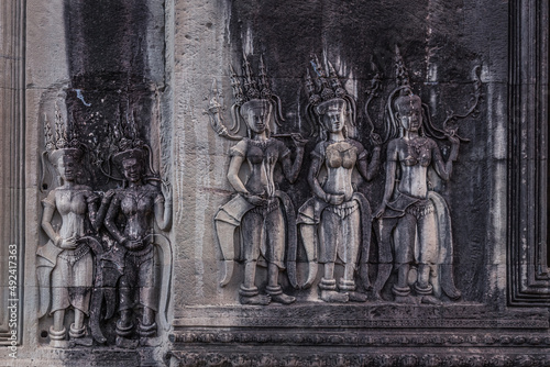 Stone bas-relief with ancient Khmer goddesses on the temple wall, Angkor, Siem Reap, Cambodia
