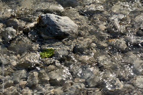 Stone, blurred pebbles and stones, a blurred green colored leaf underwater of a river in Provence. South of France.