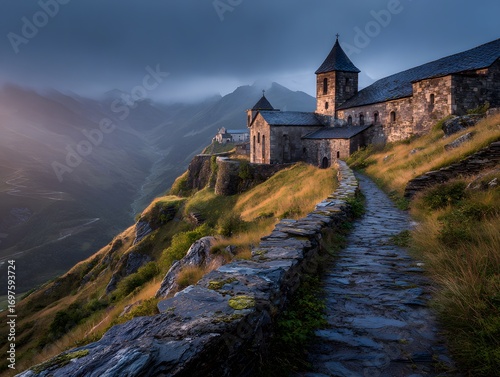Stone Building on Hill at Dusk with Mountain Vista and Cobblestone Path