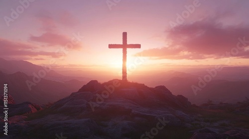 cross, stone, sunset, mountain, silhouette, sky, cloud, pink, orange, light, sun, ray, horizon, landscape, vista, scenery, nature, faith, religion, belief, spirituality, hope, peace, serenity, calm, tranquil, majestic, awe, inspiring, beautiful, divine, god, jesus christ, christianity, spiritual, worship, prayer, sacred, holy, summit, rock, peak