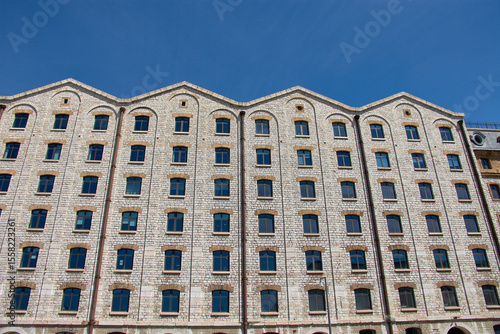 marseille, france, dock, building, stone, facades, architecture, industrial, 19th century, restoration, heritage, history, factory, window, symmetry, port, commerce, office, shopping centre, urban, city, environment, revitalization, reuse, tour tourism, culture, travel, historical building, iconic, traditional, structure, detail, exterior, day, blue skies, natural light, no people, warehouse, old, modernity, integration, destination, neighbourhood, development, rehabilitation