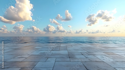 Stone Floor by the Ocean with Blue Sky and White Clouds 3D Illustration