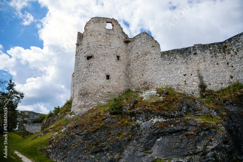 Stone gothic ruins of old medieval castle Rabi in National Park Sumava, ancient fortress in sunny spring day, landmark in countryside, stronghold on the hill, Rabi, Czech Republic