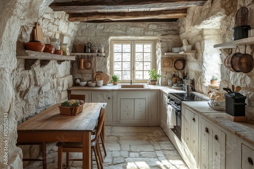 Stone house kitchen interior with cooking cabinet, dining table near window, Generative AI