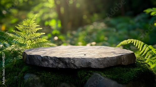Stone podium for product presentation mock-up on a natural background, stone pedestal in a jungle for cosmetic display, abstract green nature backdrop, copy space concept.