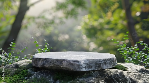Stone podium on rock platform 3d illustration, grey rock pedestal for a product display stand, green forest and blurred on the background, natural scenery landscape