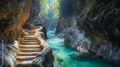 river, gorge, canyon, stair, stone, pathway, water, turquoise, blue, green, nature, landscape, scenic, travel, adventure, hike, mountain, rock, cliff, path, trail, sunlight, light, shadow, summer, beautiful, amazing, journey, exploration, serenity, calm, peaceful, tranquil, escape, relaxation, wilderness, wild, environment, ecosystem, ecology, destination, tour tourism, holiday, vacation, view, panorama, picturesque