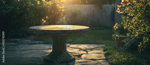 Stone table in backyard illuminated by golden sunlight during late afternoon surrounded by lush greenery and blooming flowers