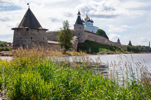 Stone tower and Pskov Kremlin fortress wall at the confluence of two rivers, Russia