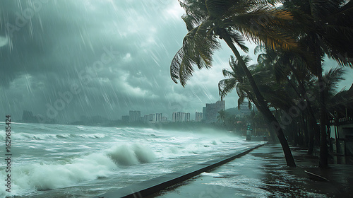 beachfront, city, storm, typhoon, coastline, crashing waves, destruction, wave, building, city landscape, flooding, ocean, monsoon, hurricane, disaster, coastal, palm tree, dark clouds, sea, apocalypse, climate change, environmental, natural disaster, dramatic, impact, surge, power, energy, scene, landscape, wind