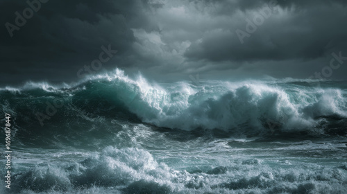 Stormy sea with dark clouds and massive waves crashing along the coast