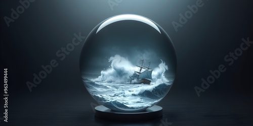 crystal ball, ship, wave, professional, floating, sphere, digital artwork, nature, water, maritime, dramatic, fantasy, surreal, atmospheric, tempest, danger, mysterious, environment