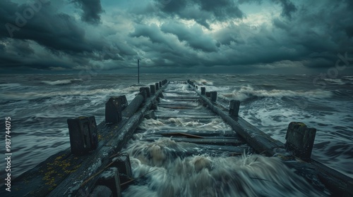 Stormy Waves Crash Over Old Pier Under Dark Clouds and Dramatic Skies