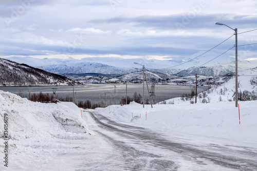 strada ghiacciata battuta dal vento in Norvegia