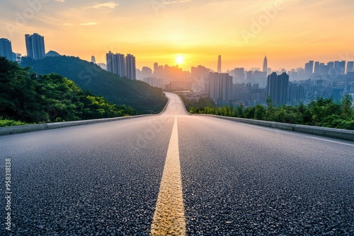 Straight asphalt highway road with modern city buildings at sunrise in Chongqing , ai