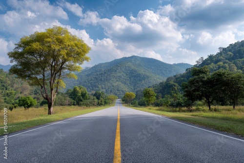 road, asphalt, mountain, sky, cloud, tree, nature, landscape, travel, outdoors, scenery, highway, straight, yellow, line, vale, green, hill, vegetation, perspective, open, expanse, journey, distance, environment, sunlight, day, summer, serene, vista, path, route, transport, tour tourism, destination, panorama, horizon, scenic, altitude, elevation, timberland, countryside, meadow, foliage, summit, peak, ridge, gradient